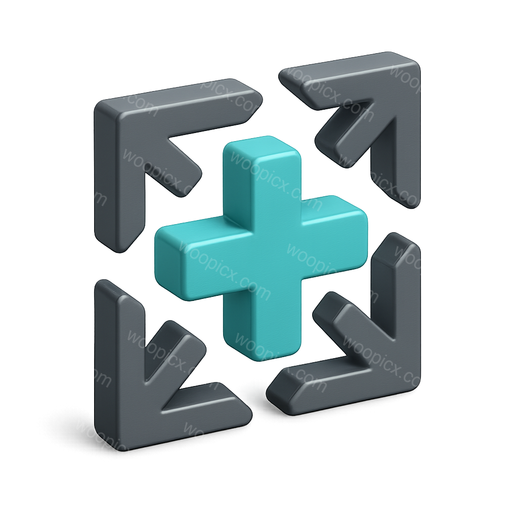 A visually striking 3D geometric design featuring a central plus icon surrounded by four directional arrows. The arrows are rendered in a sleek, modern style with a volumetric effect.