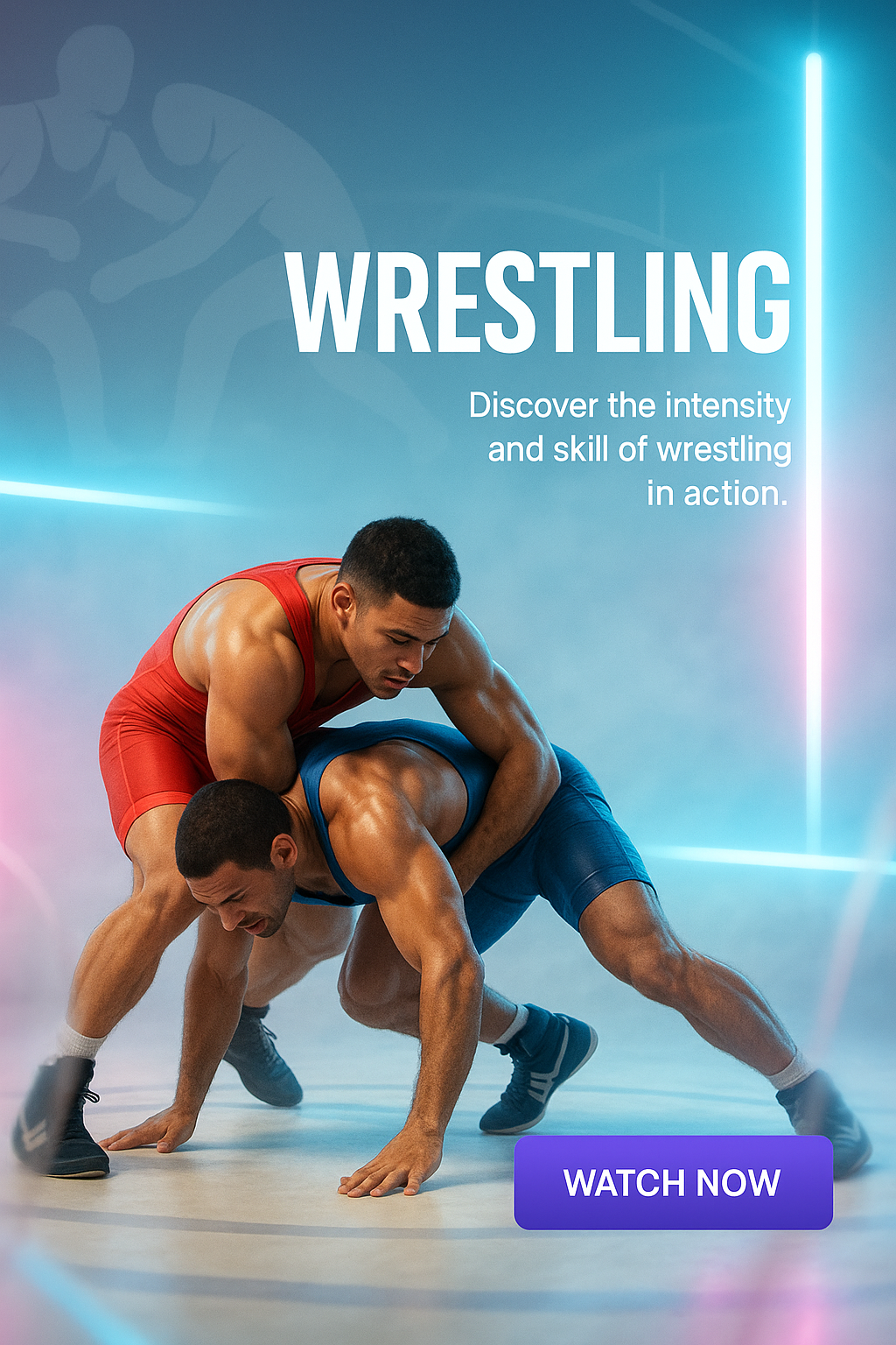 Engaging promotional graphic showcasing wrestling action with vibrant colors and a modern design, ideal for sports marketing and event promotion.