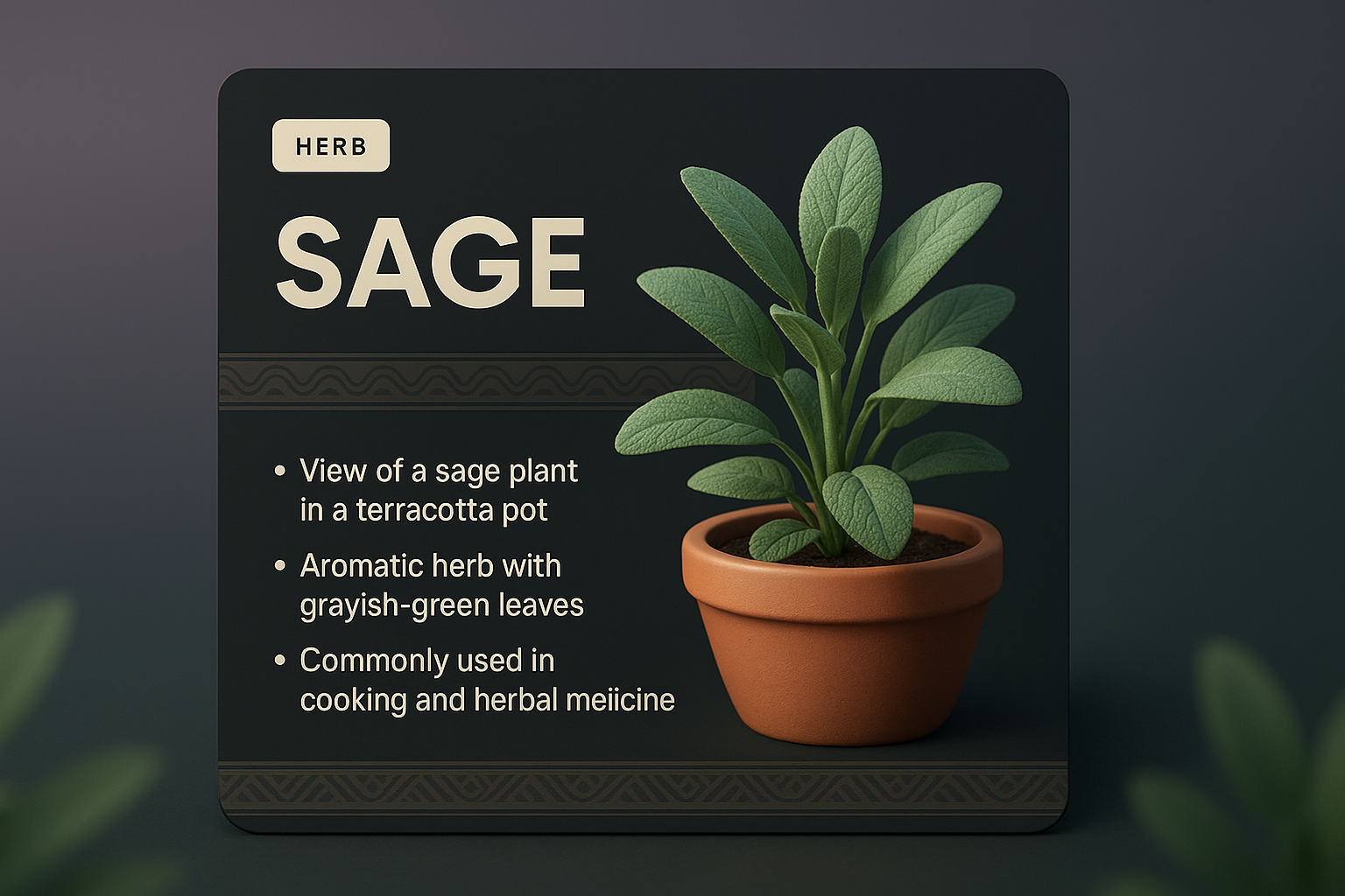 A visually striking 3D illustration of a sage plant in a terracotta pot, designed for a web layout with integrated text and graphics.