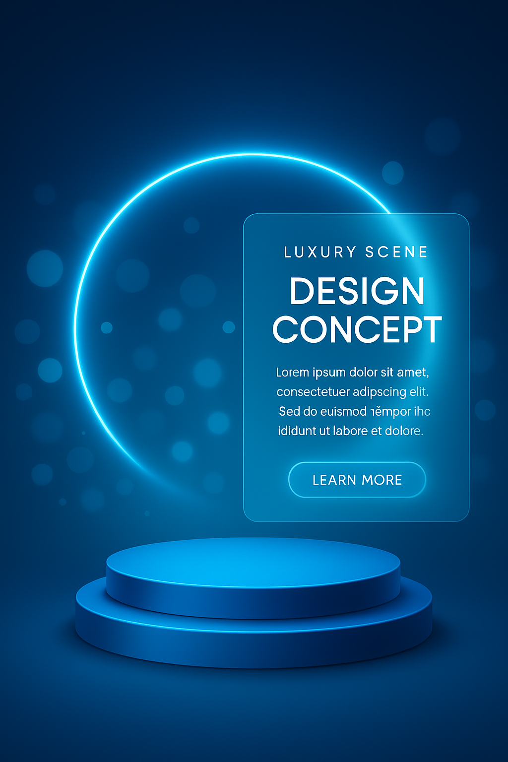 /Collection: /by davooda/Type: PNG/An empty blue podium set against a dark background, enhanced by vibrant neon effects and soft bokeh. The scene features a sleek, modern design with glassmorphism elements.