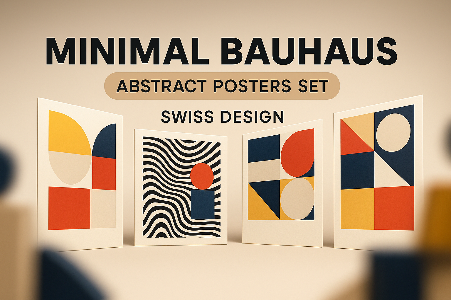 Stylish showcase of four abstract posters featuring minimal Bauhaus design elements. Ideal for interior decor or art-focused marketing.