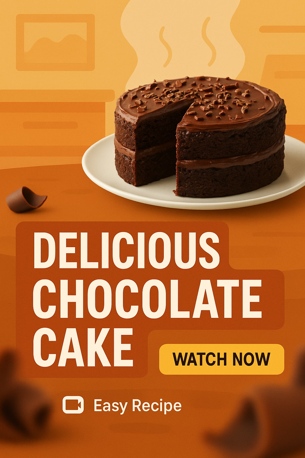 A visually appealing recipe promotional graphic showcasing a sliced chocolate cake on a plate. Ideal for food blogs or cooking channels, this design uses warm colors and clear typography to attract viewers.
