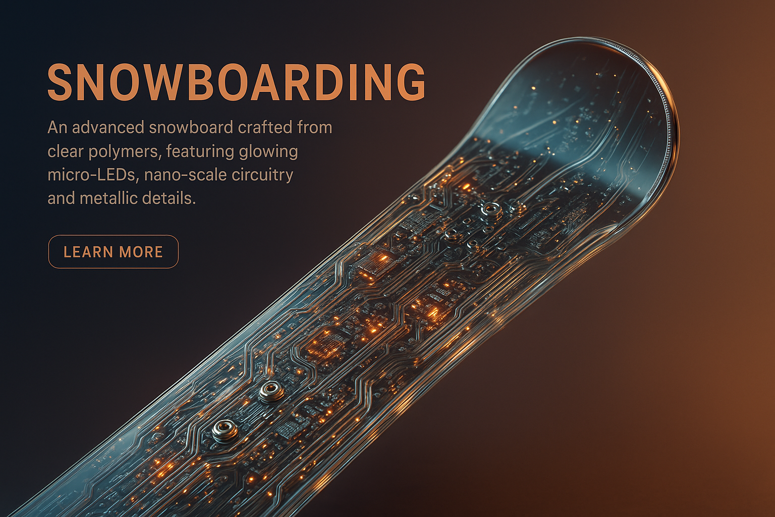 /Collection: /by davooda/Type: PNG/A hyperrealistic depiction of an advanced snowboard made from clear polymers, showcasing illuminated micro-LEDs and intricate circuitry. The design features metallic components and elegant lighting effects.