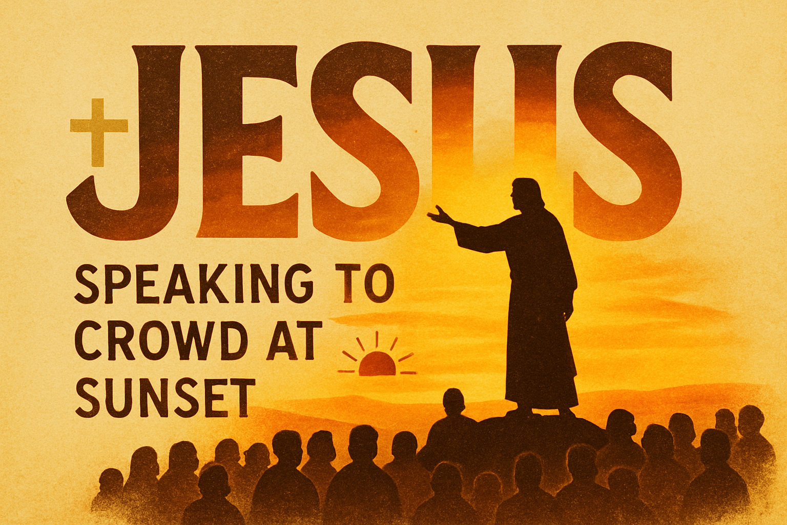 A stylized graphic depicting Jesus addressing a crowd at sunset with warm hues, ideal for religious themes and inspirational content.