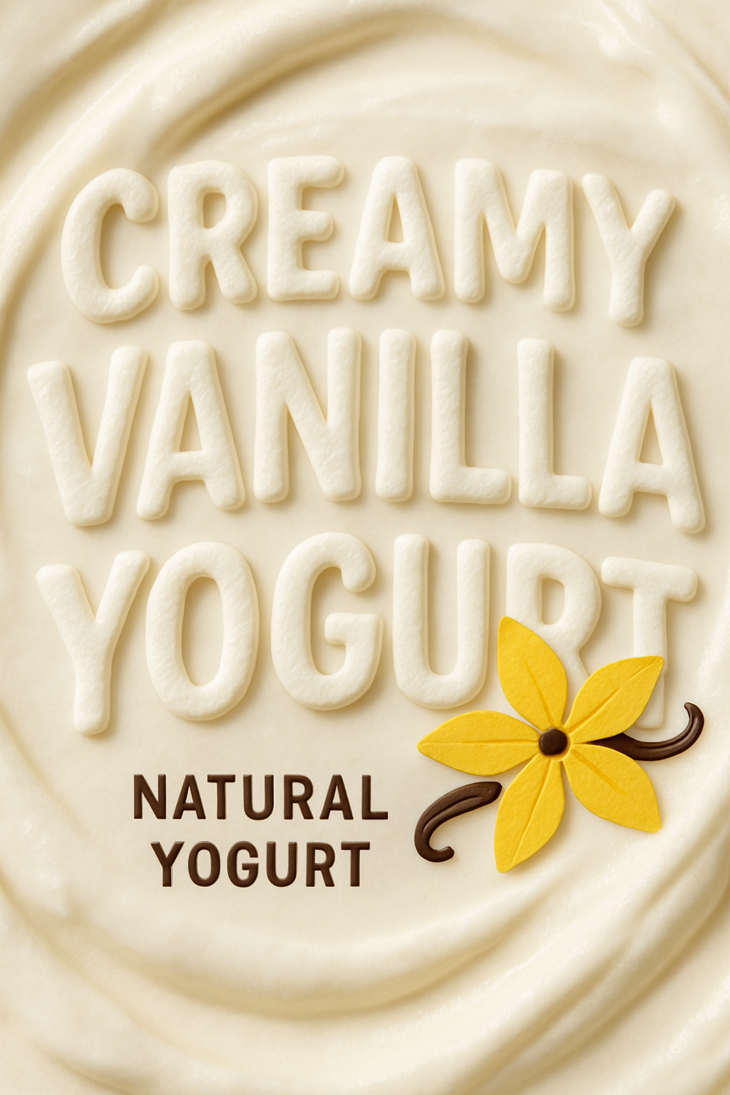 A product label for creamy vanilla yogurt featuring bold typography and a floral design element. Ideal for packaging in dairy products.