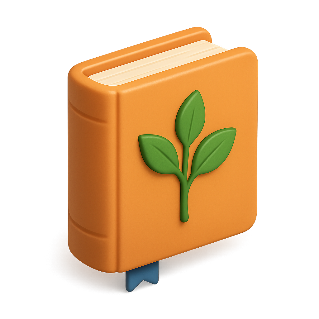 A vibrant, stylized 3D icon representing botany, featuring an orange book with green leaves emerging from it, set against a soft gradient background.