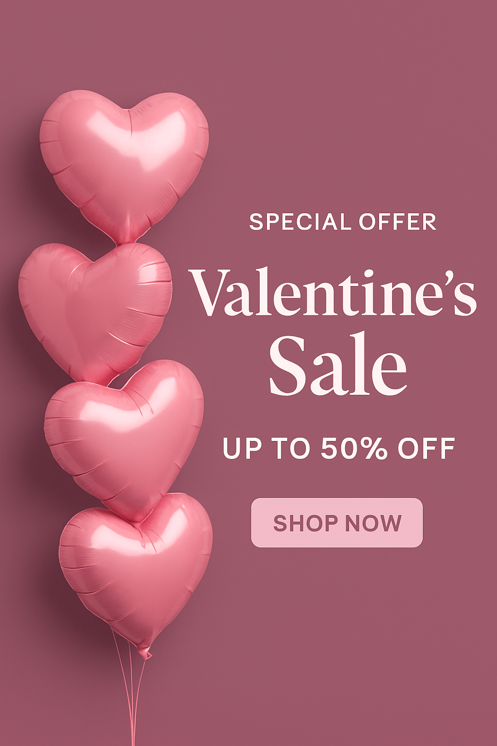 Charming promotional banner featuring heart-shaped balloons, perfect for Valentine's Day marketing. The design combines playful elements with elegant typography.