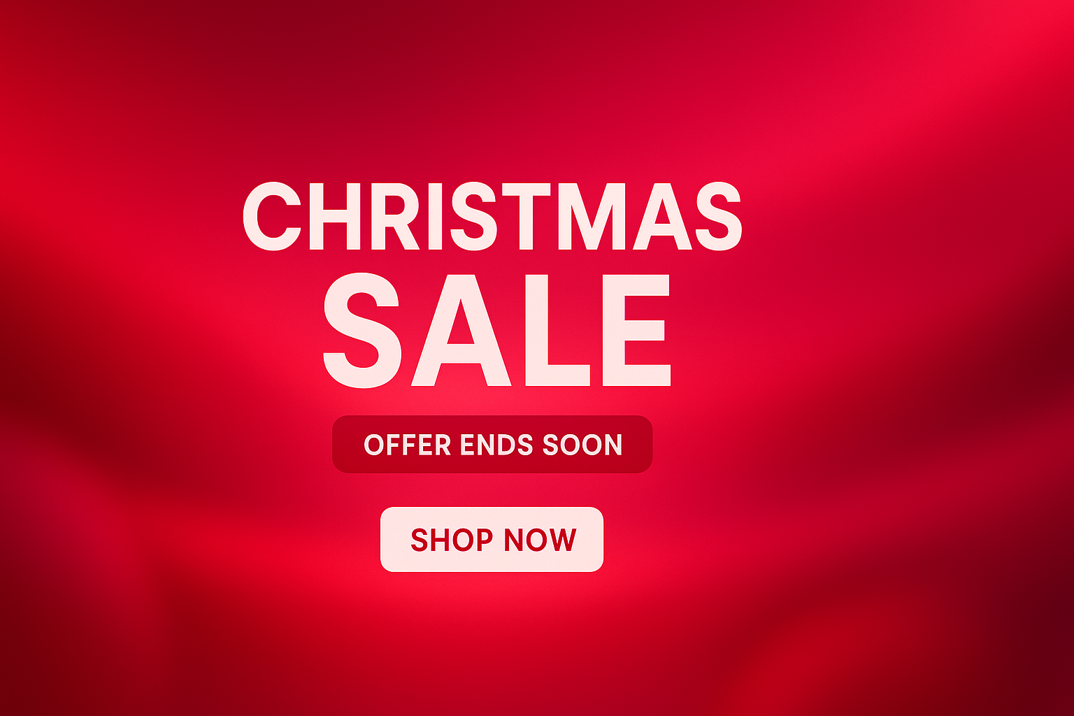 Vibrant promotional banner for a Christmas sale featuring bold typography on a rich red background. Ideal for e-commerce marketing and holiday promotions.
