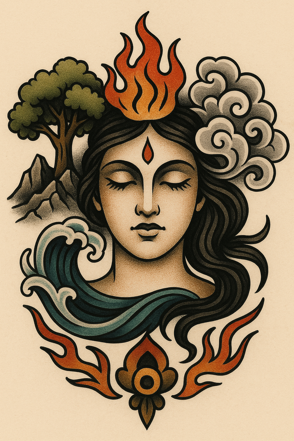 /Collection: /by davooda/Type: PNG/This is a detailed illustration featuring a goddess surrounded by stylized natural elements like water, fire, and mountains. The artwork uses bold colors and intricate linework, ideal for tattoo design or art prints.