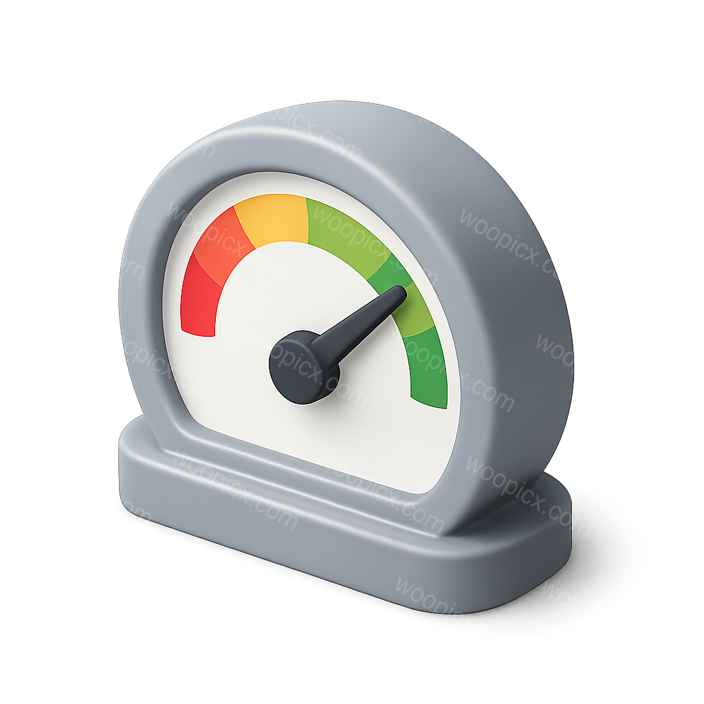A sleek 3D icon of a gauge displaying levels with a smooth isometric design. It features a colorful gradient ranging from red to green, set against a simple background.