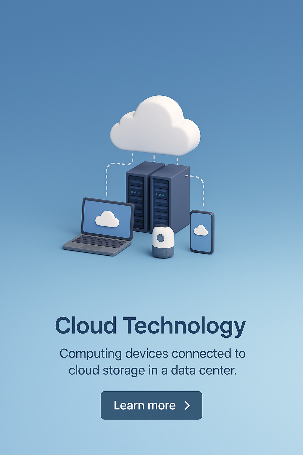 /Collection: /by davooda/Type: PNG/A 3D illustration depicting cloud technology, showcasing devices like a laptop, tablet, and smartphone connected to a data center. The design features a smooth gradient background and a clear layout for easy readability.