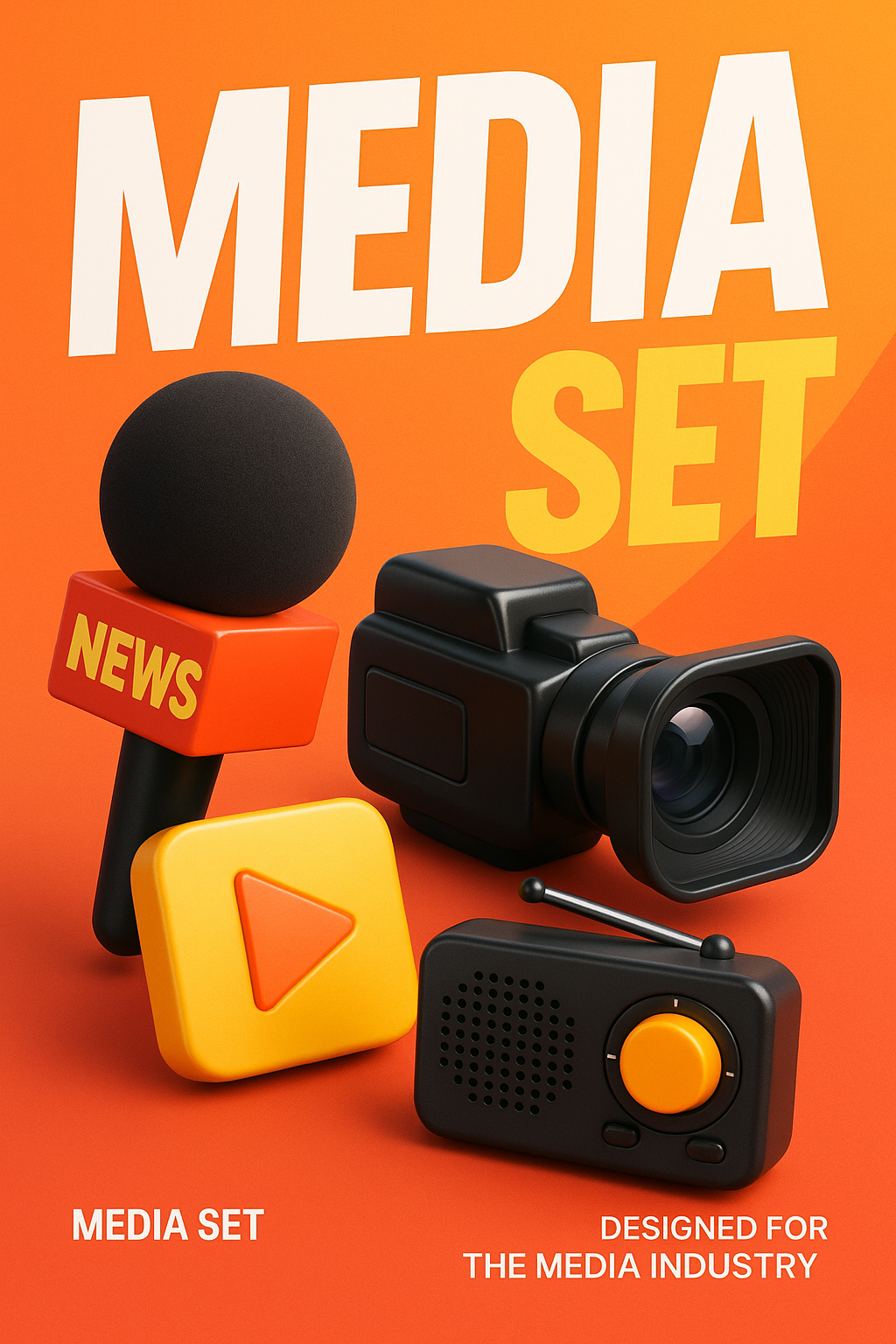 A sleek, hyper-realistic media set featuring a microphone, camera, play button, and radio. The bold background uses bright color blocks and playful gradients.