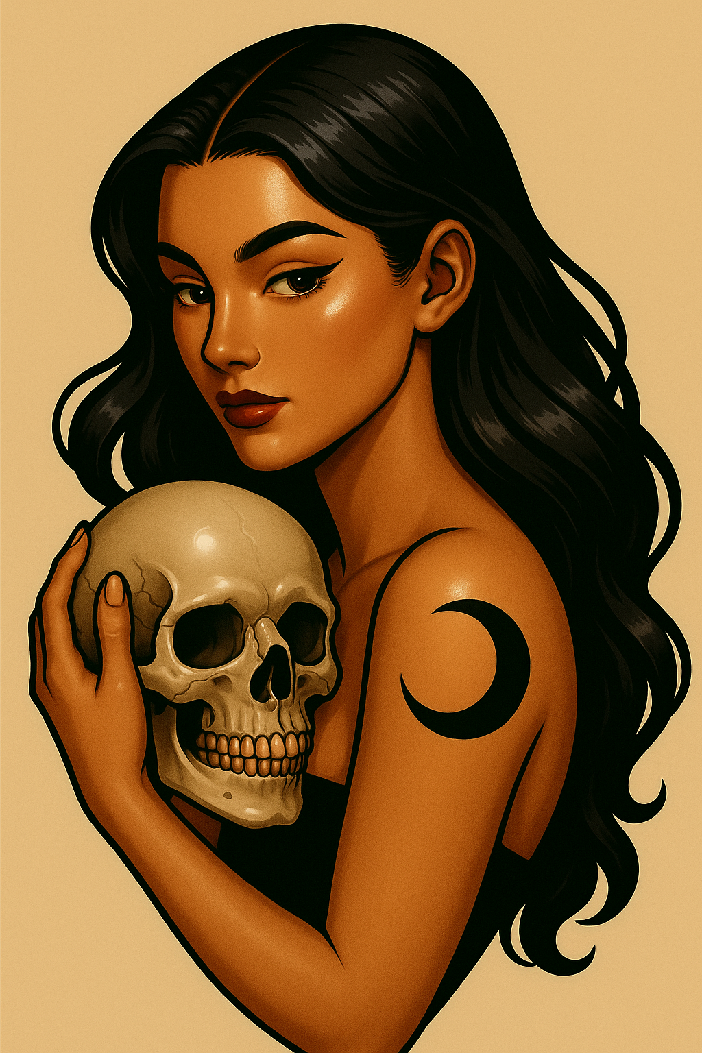 A stylized illustration of a woman holding a skull, featuring a crescent moon tattoo on her arm. The artwork showcases glossy anime-like highlights and a beige background.