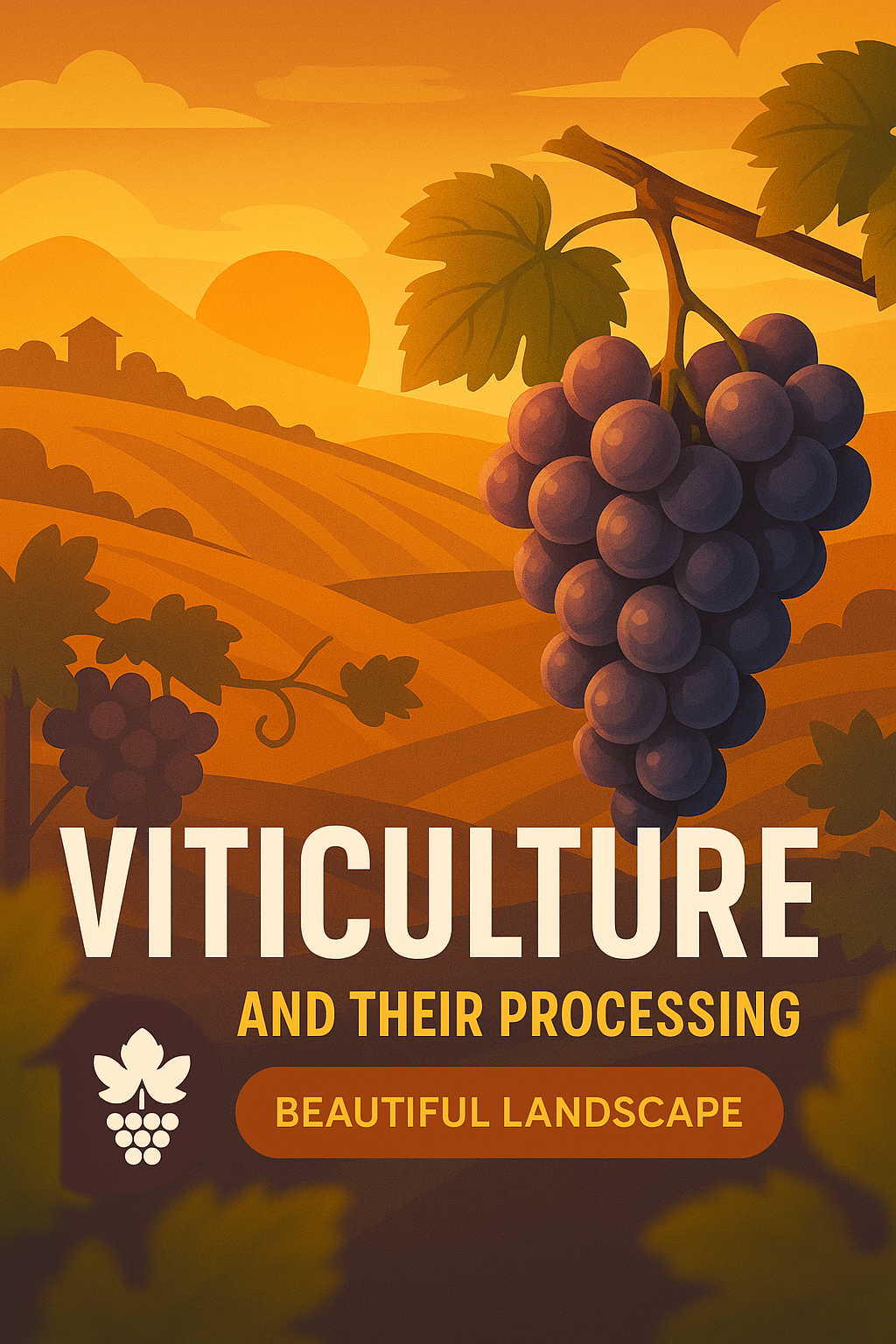 A colorful illustration depicting viticulture, featuring grapes and a scenic landscape, ideal for educational materials or wine-related content.