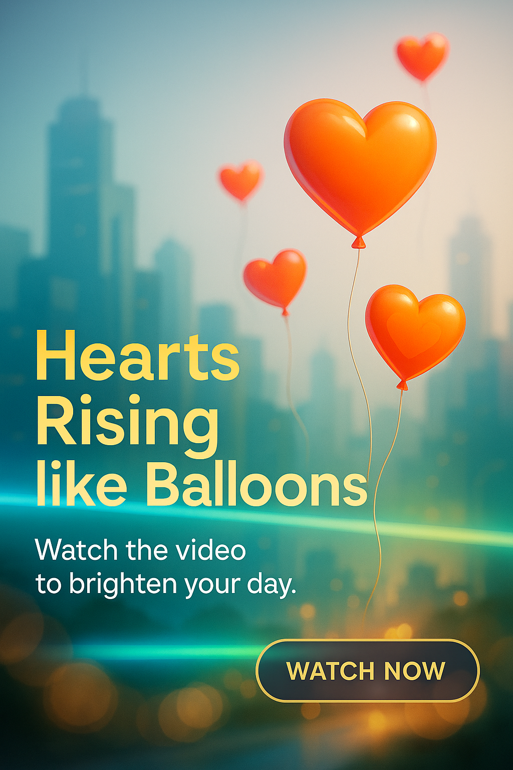 /Collection: /by davooda/Type: PNG/Colorful promotional graphic featuring heart-shaped balloons against a cityscape backdrop, designed to attract viewers to a video. Ideal for social media engagement.
