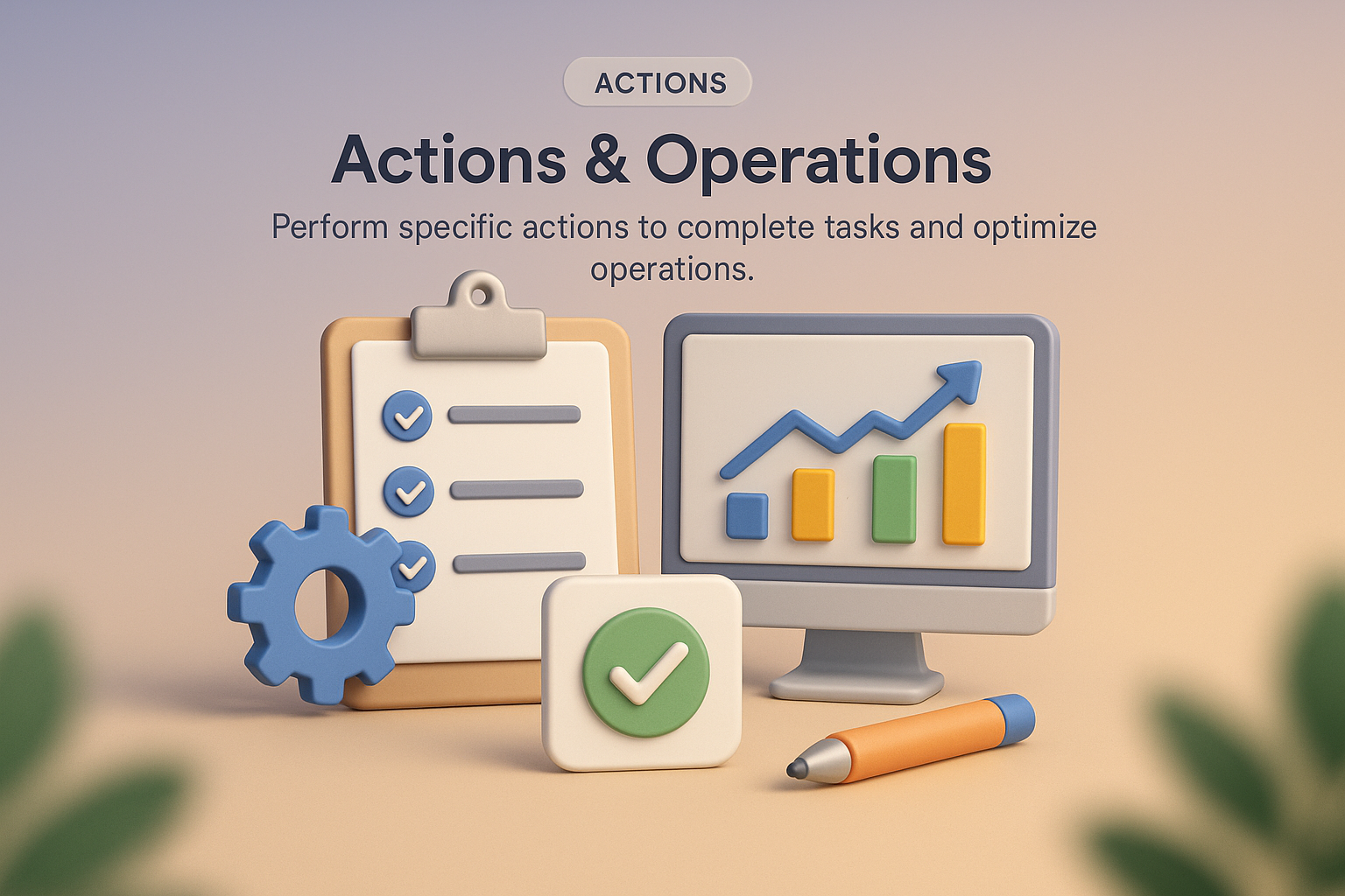 /Collection: /by davooda/Type: PNG/A visually appealing 3D illustration showcasing elements related to actions and operations. Objects include a checklist, a computer monitor with graphs, and a gear, all set against a gradient background.
