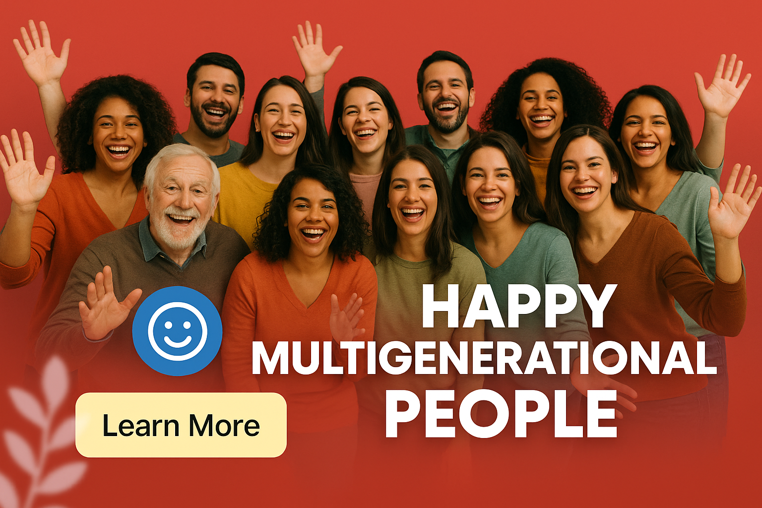 Vibrant social media post showcasing a diverse group of happy individuals from different generations, perfect for promoting community and connection themes.