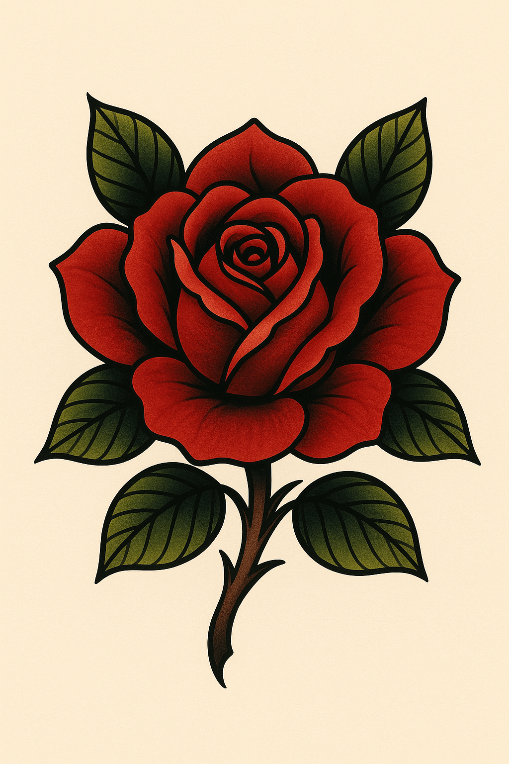 A detailed illustration of a red rose with green leaves, showcasing bold colors and clear lines. Ideal for use in floral designs, tattoos, or decorative art.
