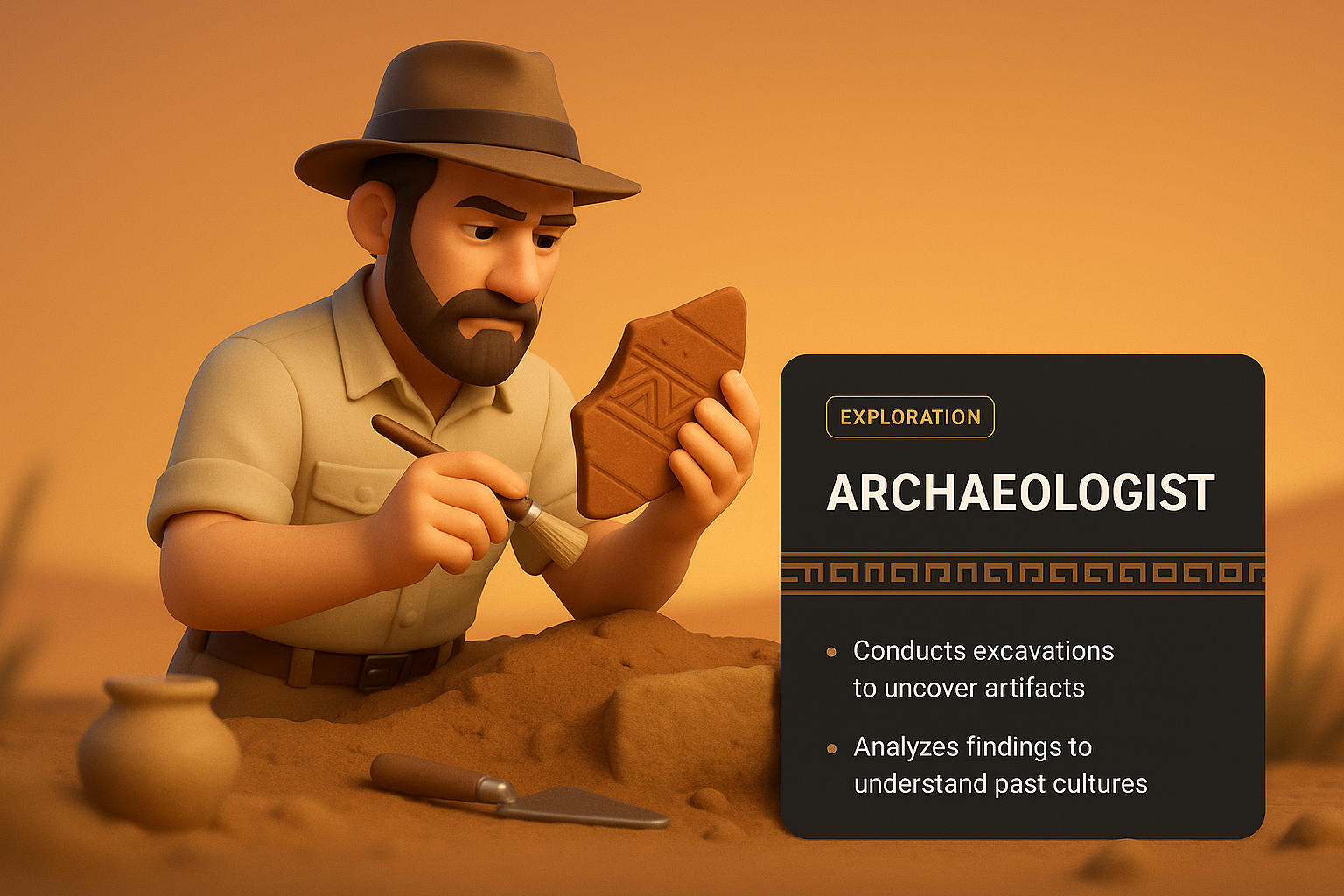 /Collection: /by davooda/Type: PNG/A detailed 3D illustration of an archaeologist examining an artifact in a sandy environment. The scene includes a gradient background and integrated text elements highlighting the archaeologist's role.
