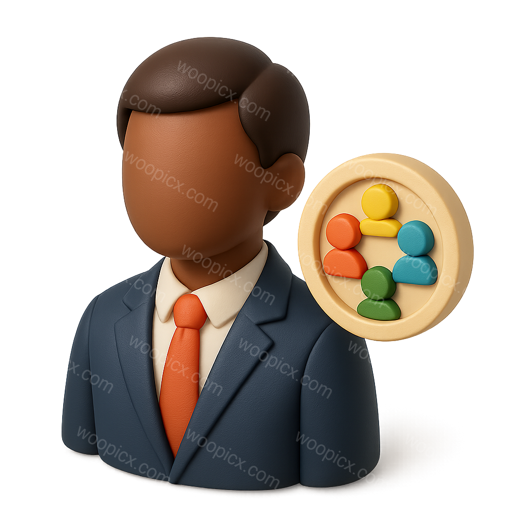 /Premium/Collection: /by davooda/Type: PNG/This image features a 3D icon of a diversity and inclusion officer, depicted in a three-quarter view. The figure is dressed in a suit with a vibrant orange tie, accompanied by a circular icon showcasing diverse figures in various colors, symbolizing community and inclusivity.