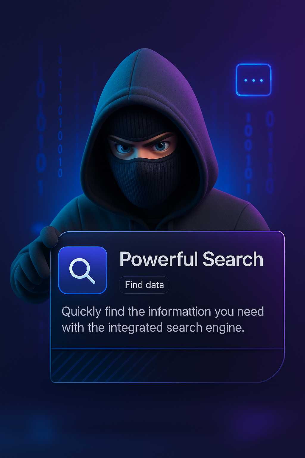 /Collection: /by davooda/Type: PNG/A masked hacker in a dark setting, showcasing a digital search interface. The design features a powerful search bar with blue accents, emphasizing data retrieval.