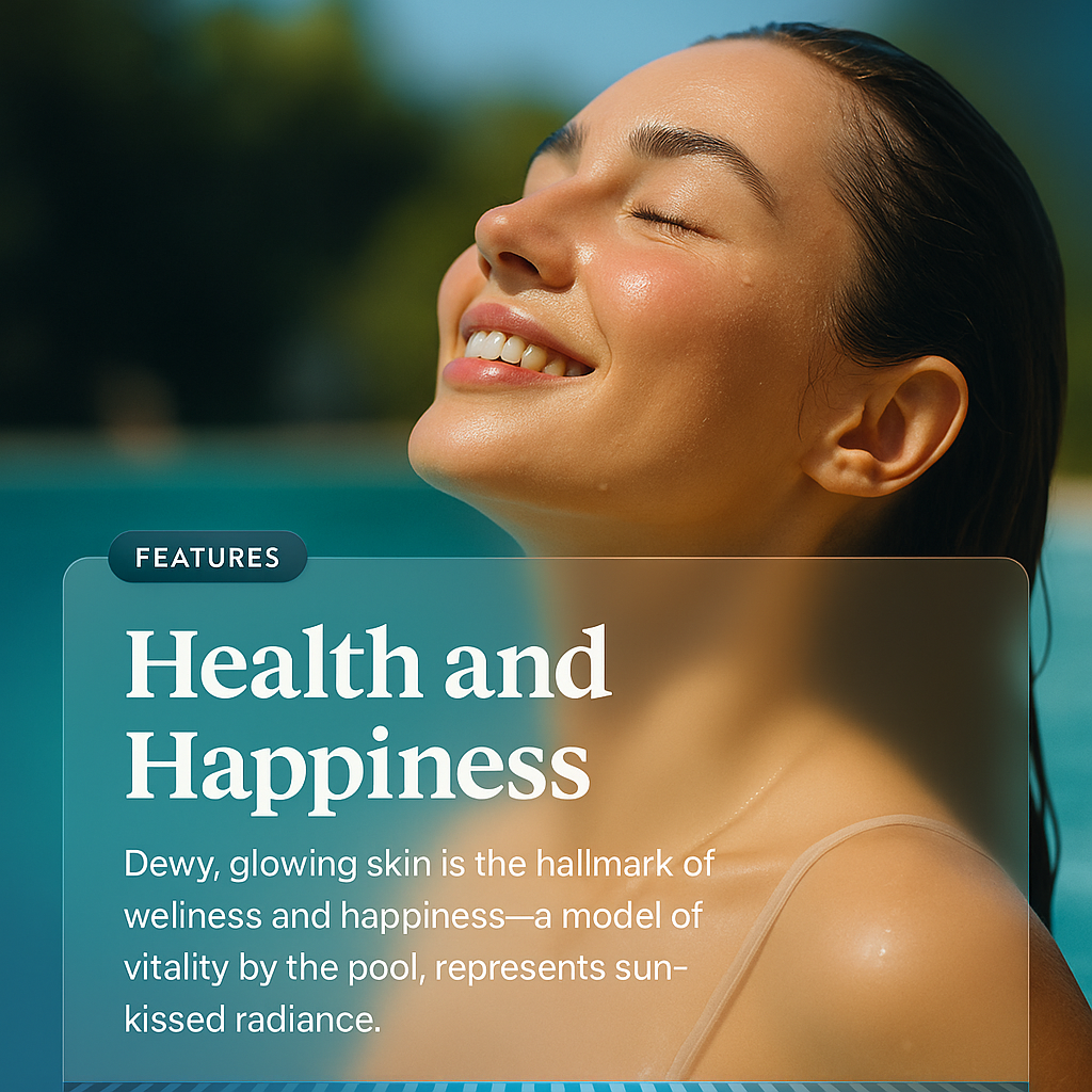 A joyful woman with dewy skin basks in the summer sun by the pool, radiating wellness and happiness. The image captures a feeling of vitality and relaxation.