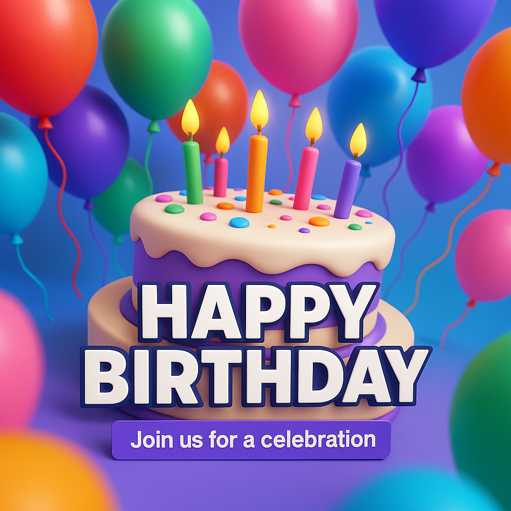 This vibrant graphic features a birthday cake with candles and colorful balloons, ideal for social media posts or invitations celebrating birthdays.