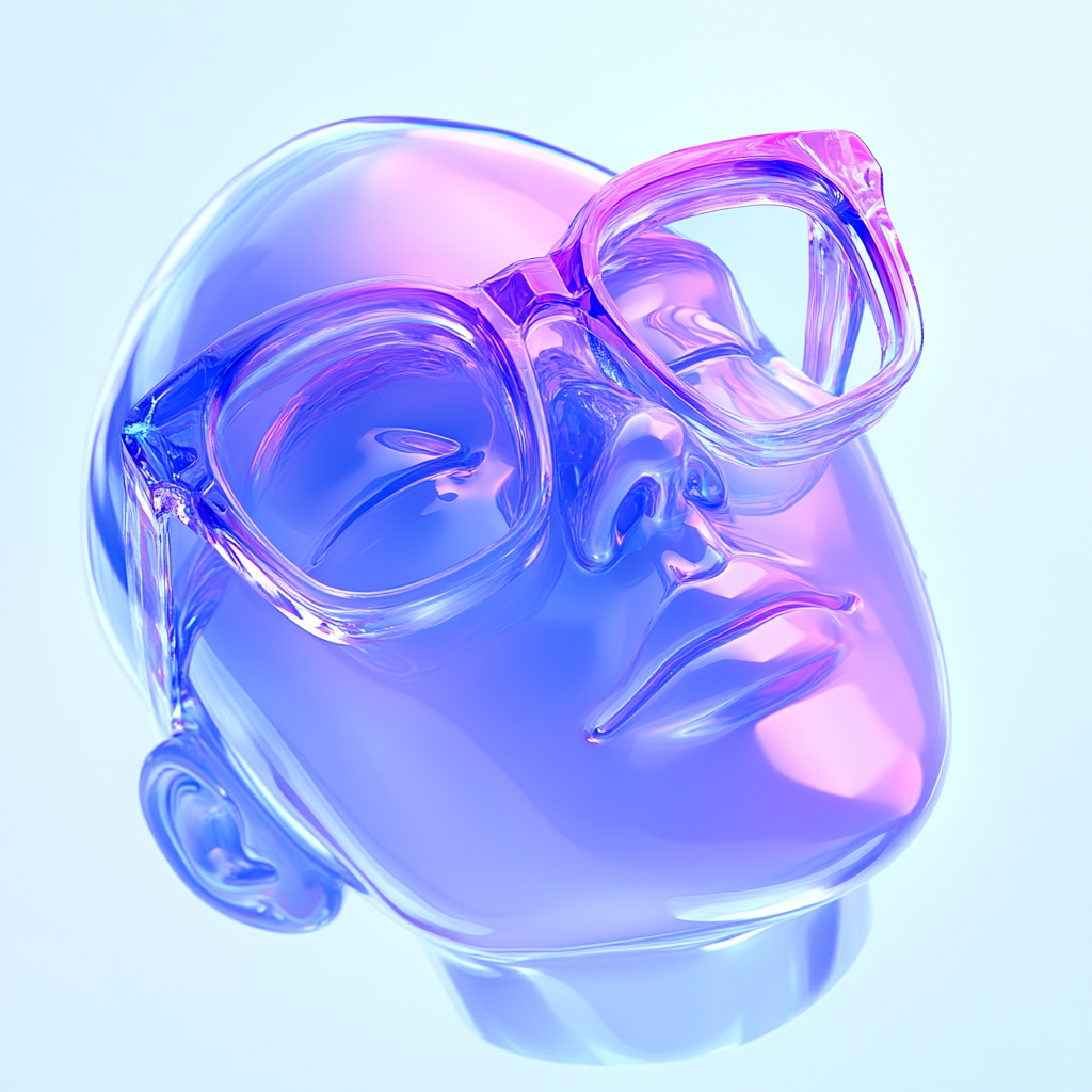 A visually striking graphic featuring a translucent mannequin head wearing oversized glasses. The design uses a vibrant color palette of purple and blue, making it ideal for fashion or eyewear promotions.