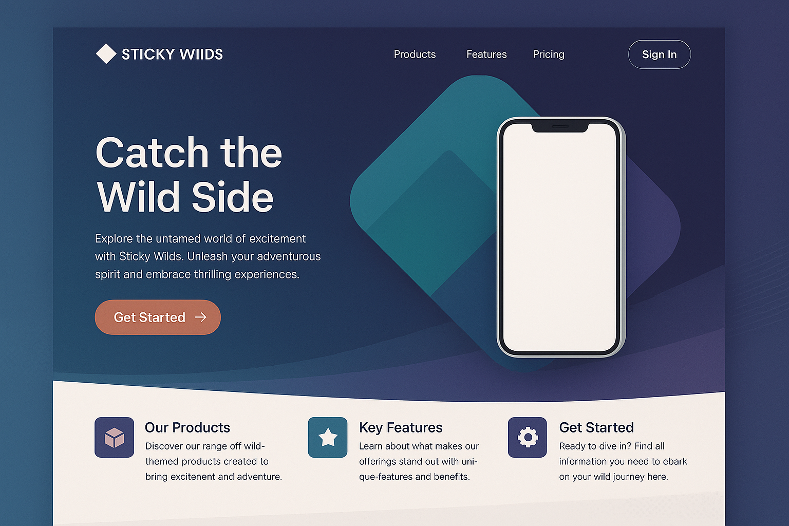 /Collection: /by davooda/Type: PNG/A visually appealing landing page featuring a geometric logo, a mobile phone display, and an engaging layout. Includes action buttons and product highlights.