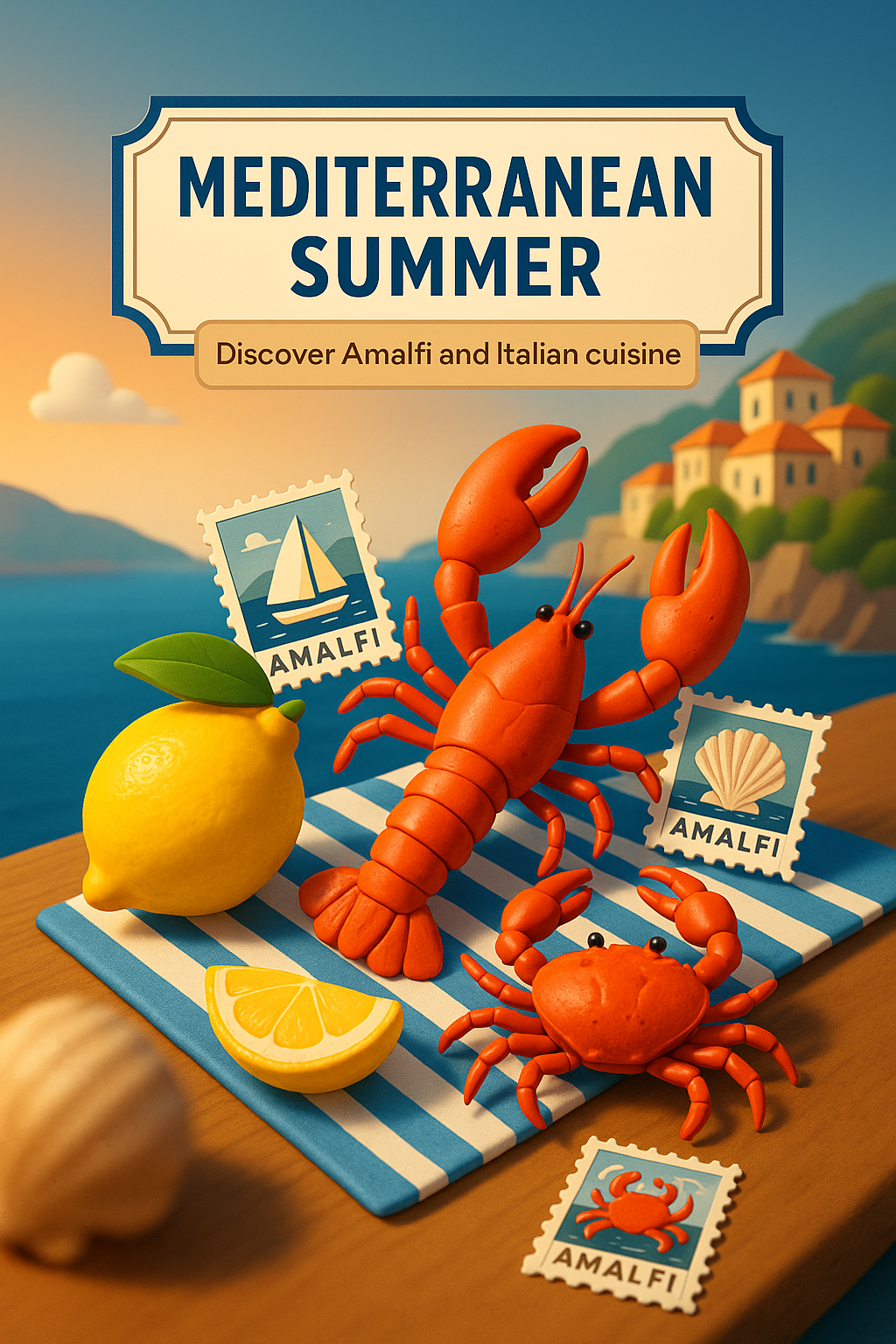 A vibrant illustration depicting a Mediterranean summer theme with playful lobster and lemon elements, ideal for promoting Italian cuisine and travel.
