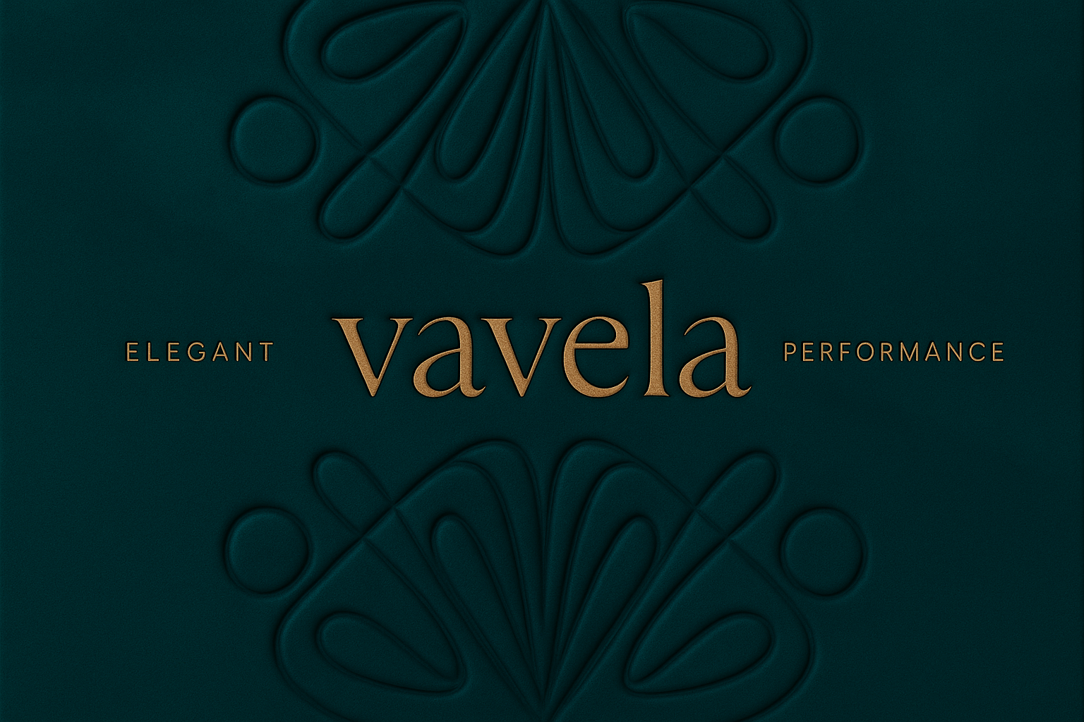 This image features elegant, embossed patterns and stylized text on a dark background. The design showcases a sophisticated interplay of curves and lines.