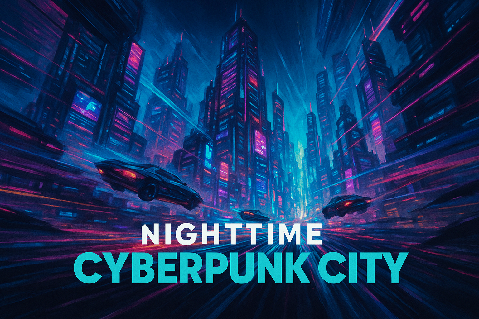 A stunning digital illustration of a cyberpunk city at night, showcasing skyscrapers, neon lights, and flying cars. The dynamic composition emphasizes movement and energy.