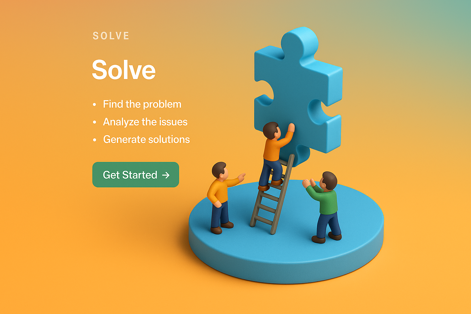 A vibrant 3D scene depicting small figures working together on a puzzle piece, showcasing a collaborative problem-solving theme. The background features a smooth gradient.
