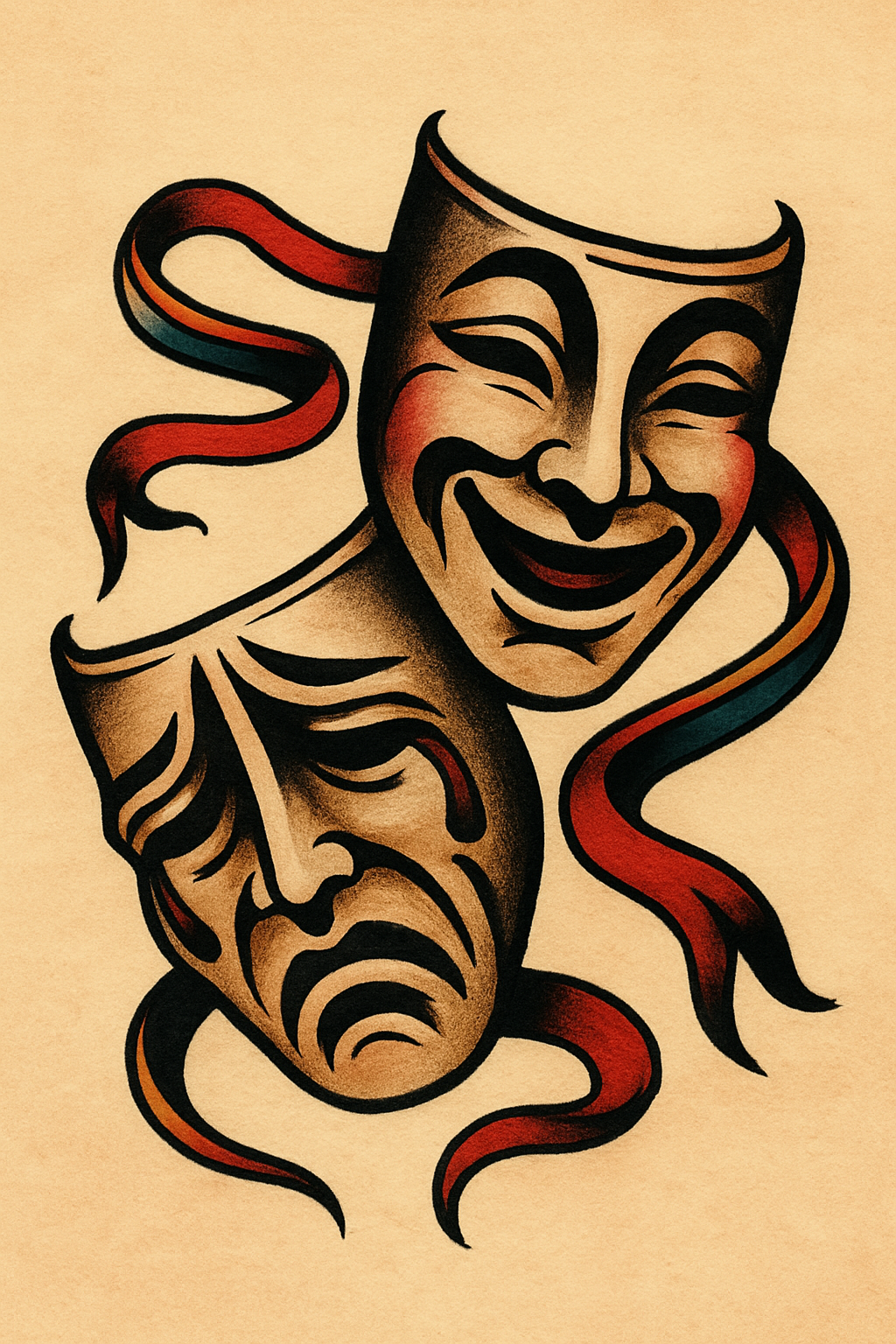 A classic tattoo design featuring two theatrical masks, one smiling and one sad, adorned with colorful ribbons on a lightly beige background.