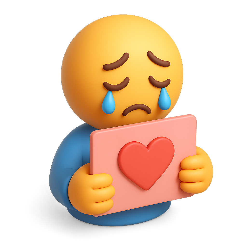 /Collection: /by davooda/Type: PNG/A vibrant 3D icon depicting a yellow emoticon with a sad expression, holding a pink card featuring a heart. The design showcases a three-quarter view with a volumetric and isometric feel.