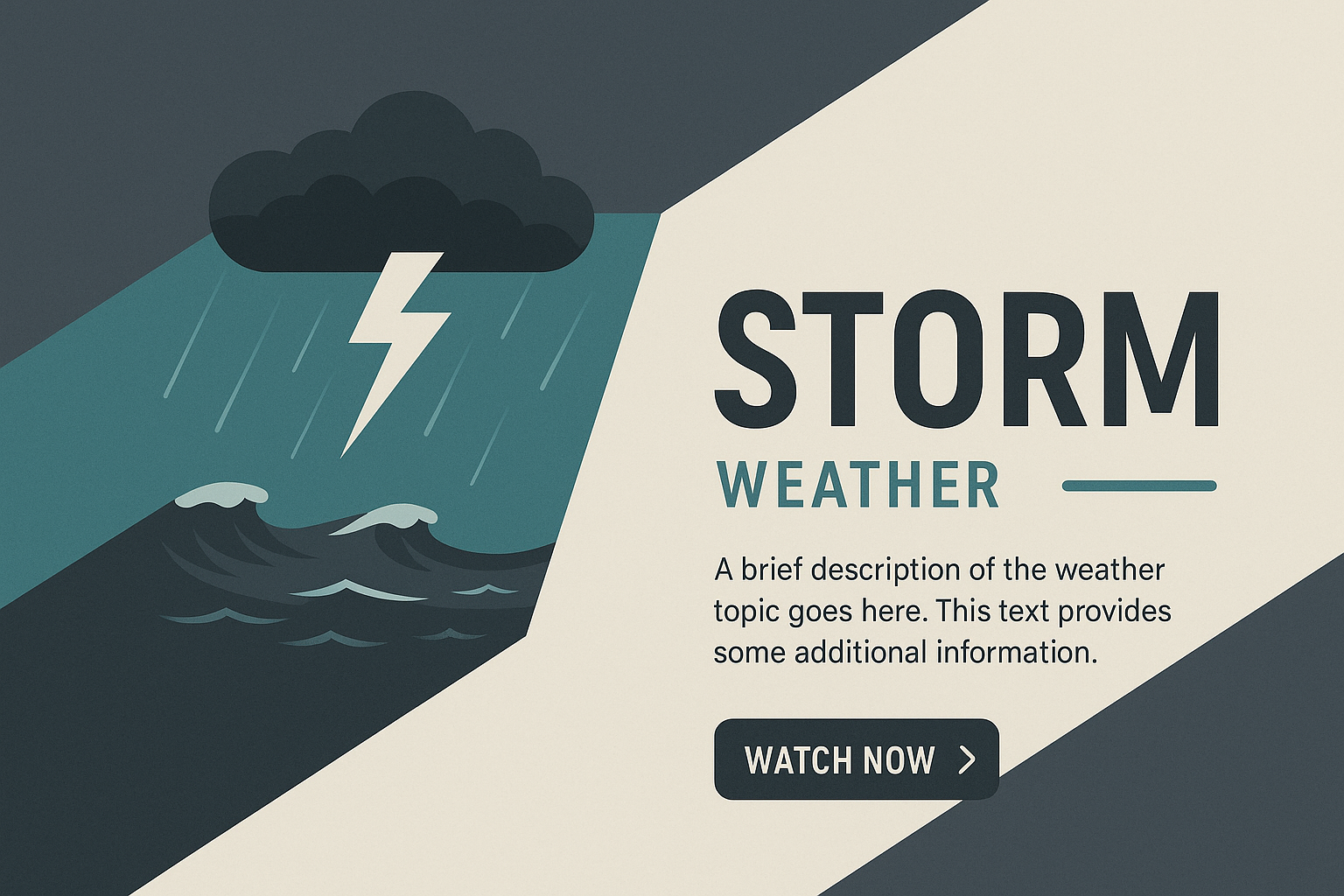 A graphic representation of storm weather featuring layered geometric elements, dark clouds, lightning, and waves. The design includes a call-to-action button and a brief description.