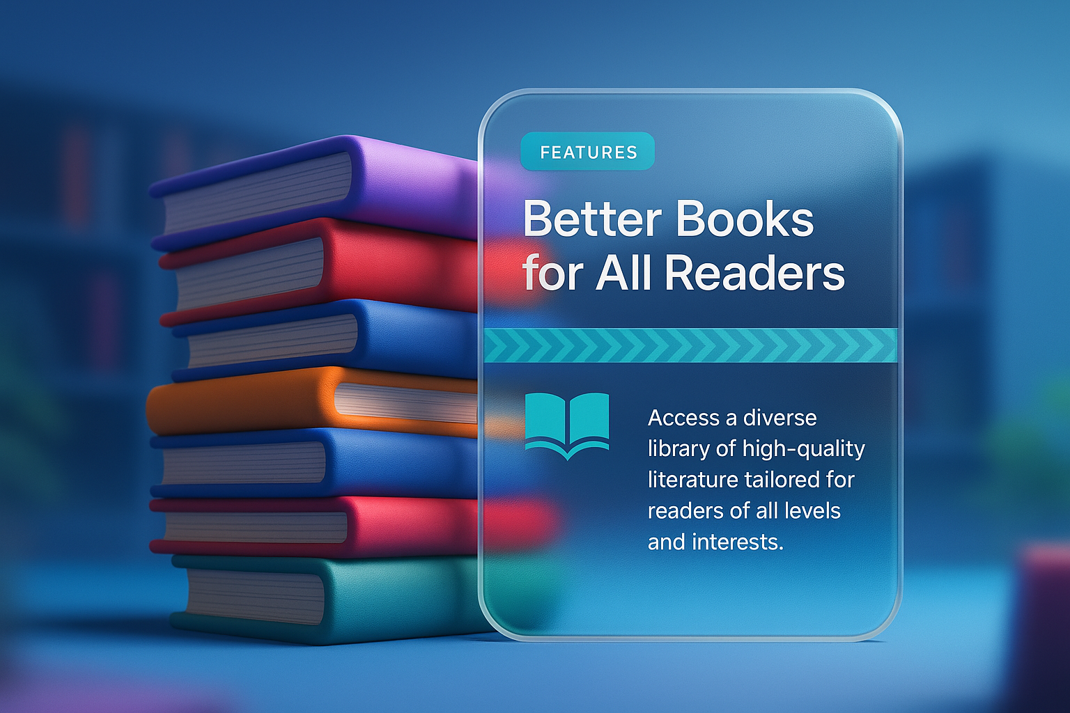 /Collection: /by davooda/Type: PNG/A vibrant stack of books in a library setting, accompanied by a translucent overlay detailing features of a literature library. The design emphasizes accessibility and diversity.