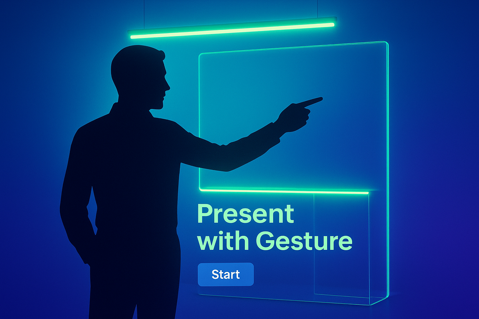 /Collection: /by davooda/Type: PNG/A silhouetted man is depicted making a pointing gesture against a vibrant blue background. Neon strips emit a soft glow, enhancing the semi-transparent glass elements present in the scene.
