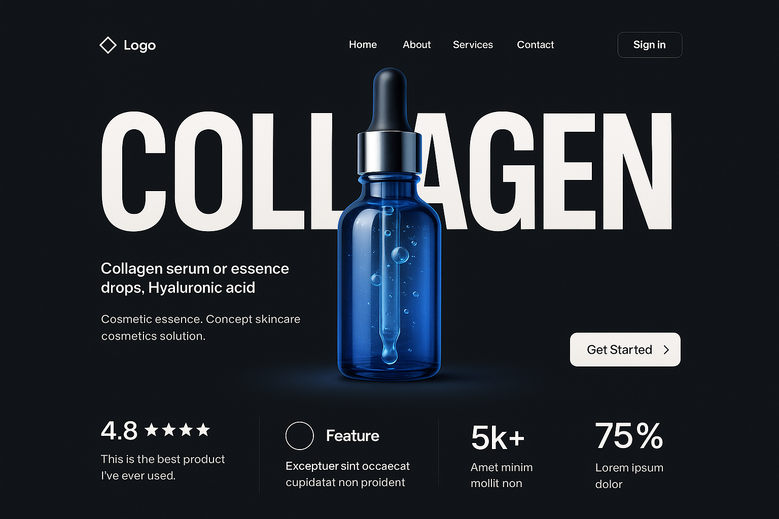 /Collection: /by davooda/Type: PNG/A sleek landing page layout showcasing a collagen serum bottle with a bold headline and modern design elements. The layout features detailed 3D rendering and minimal typography.