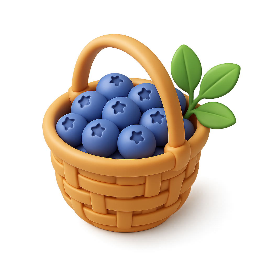 A 3D isometric icon featuring a basket filled with vibrant blueberries and green leaves. The design has a volumetric feel with a transparent background.