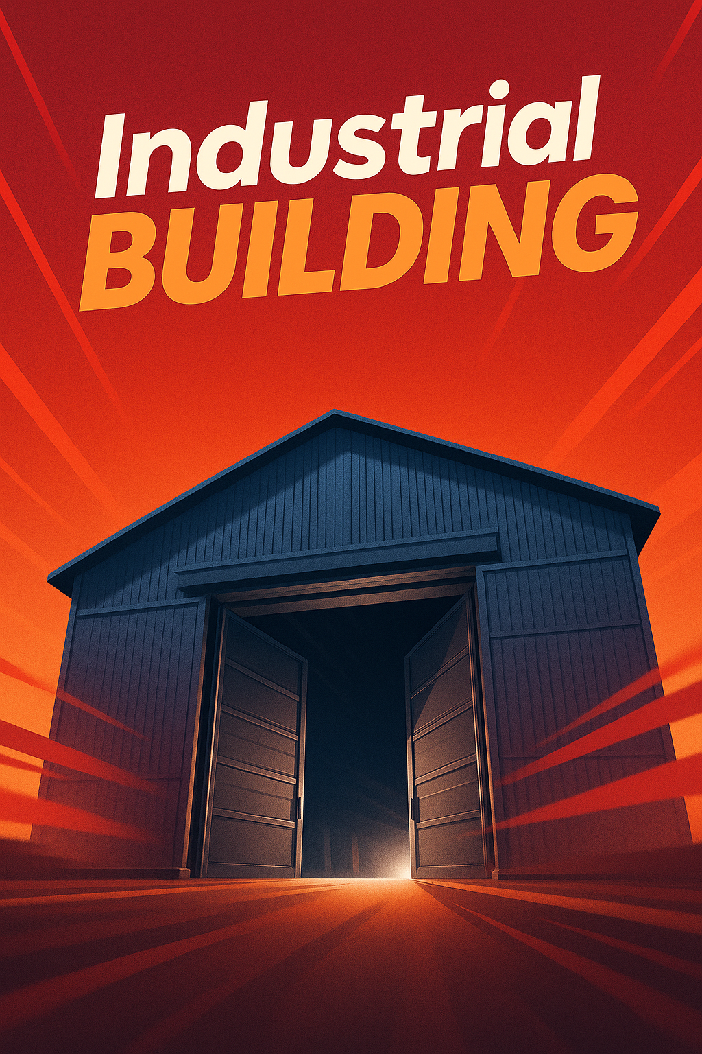 /Collection: /by davooda/Type: PNG/A striking illustration showcasing a large industrial building with wide open doors, set against a vibrant gradient background. Dynamic rays radiate from the center, enhancing the visual depth.