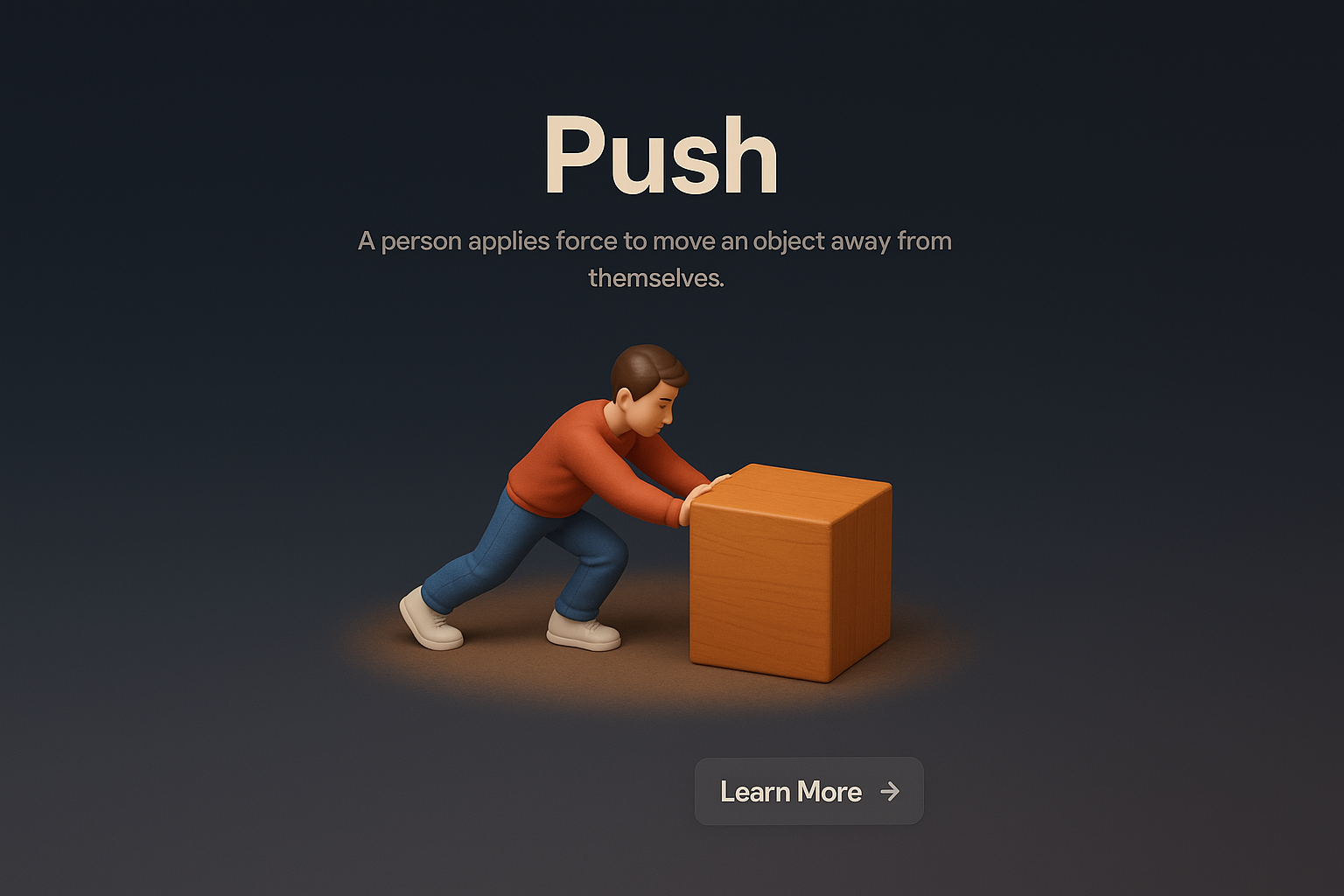 A 3D illustration showing a person pushing a cube, viewed from a high angle. The dark gradient background enhances the focus on the character and the action.