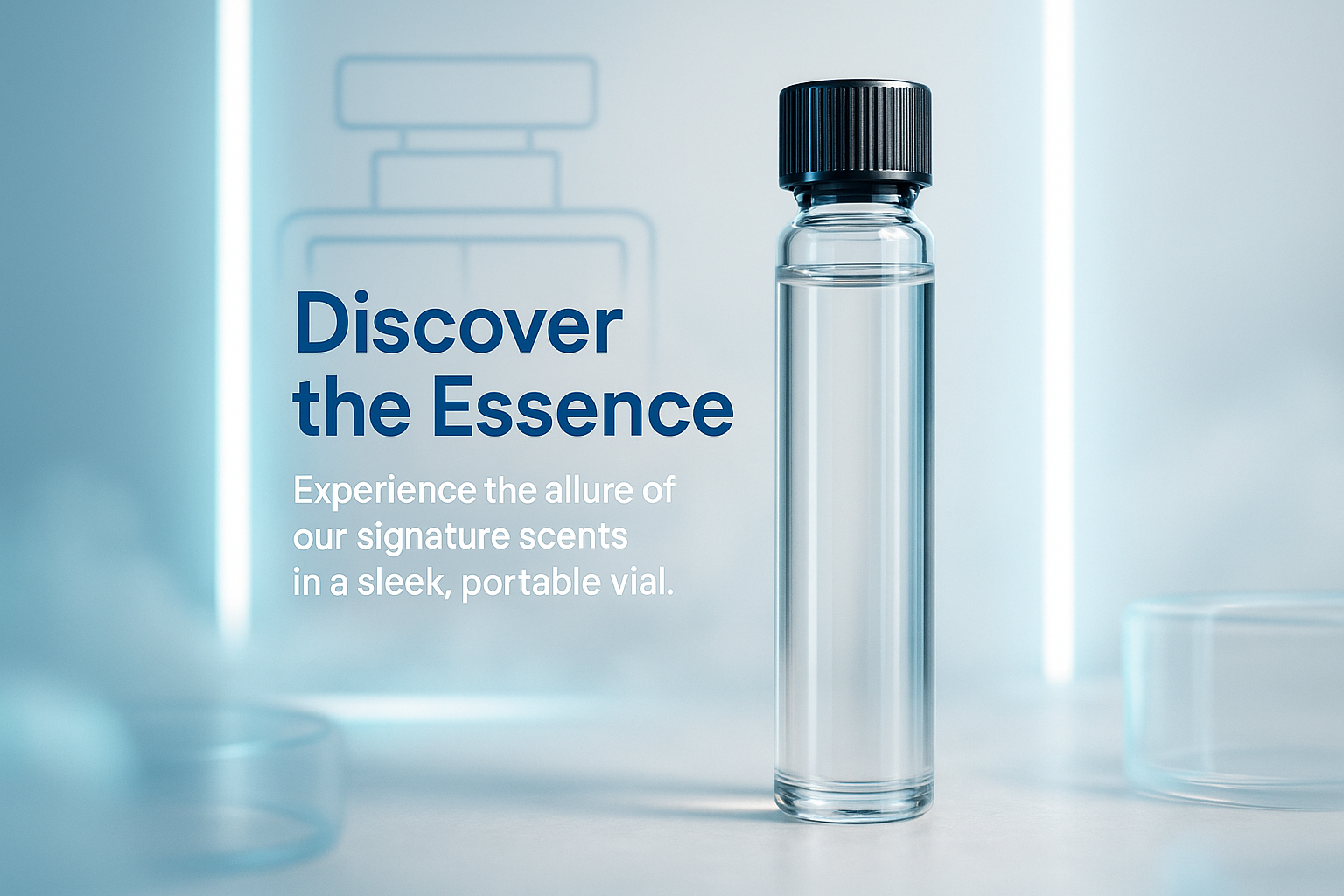 A sleek promotional graphic featuring a transparent fragrance vial set against a soft blue background, ideal for marketing portable scent samples.