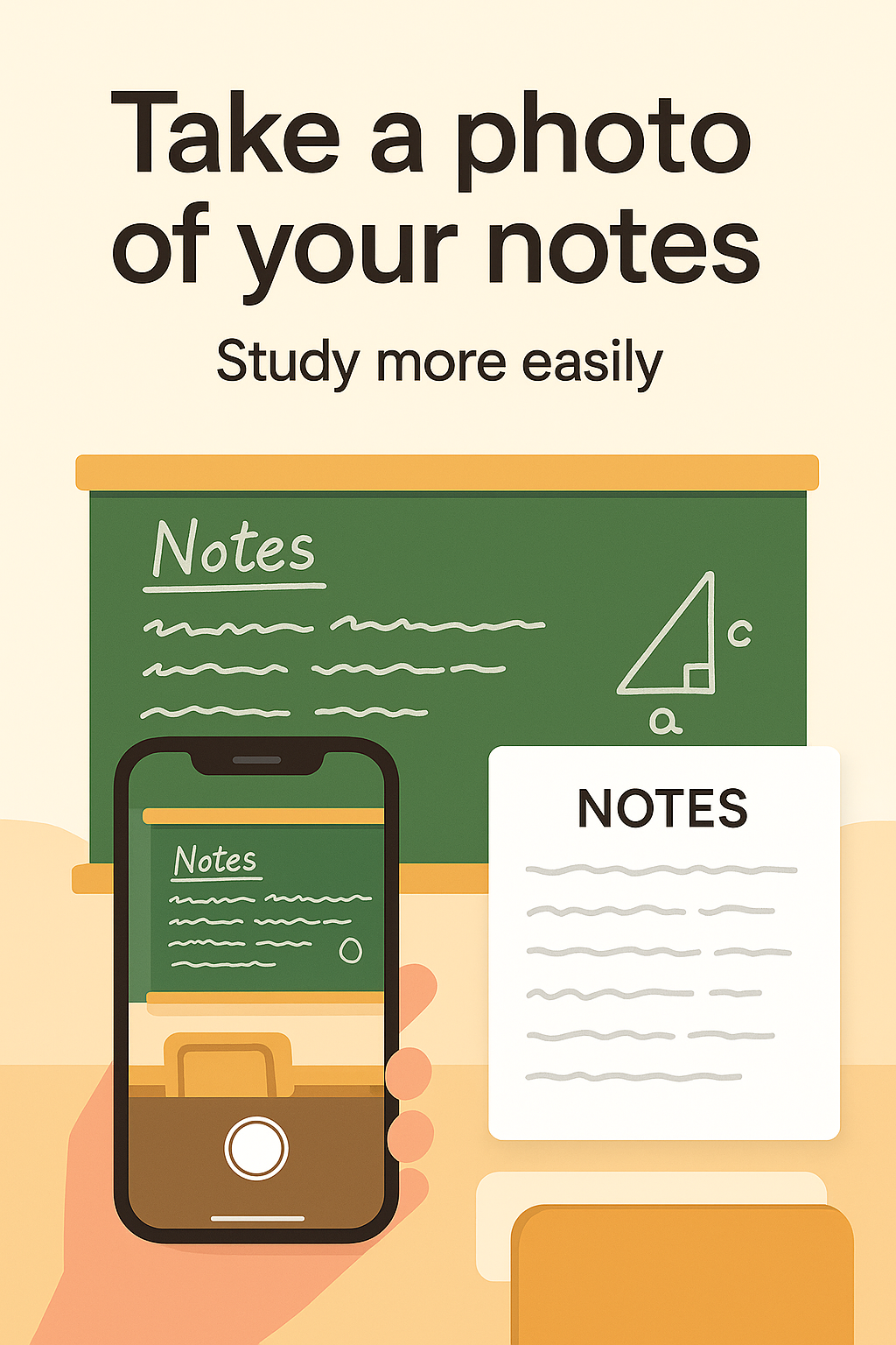 Illustrative graphic promoting an educational app that encourages users to take photos of their notes for easier studying, featuring a smartphone and chalkboard.