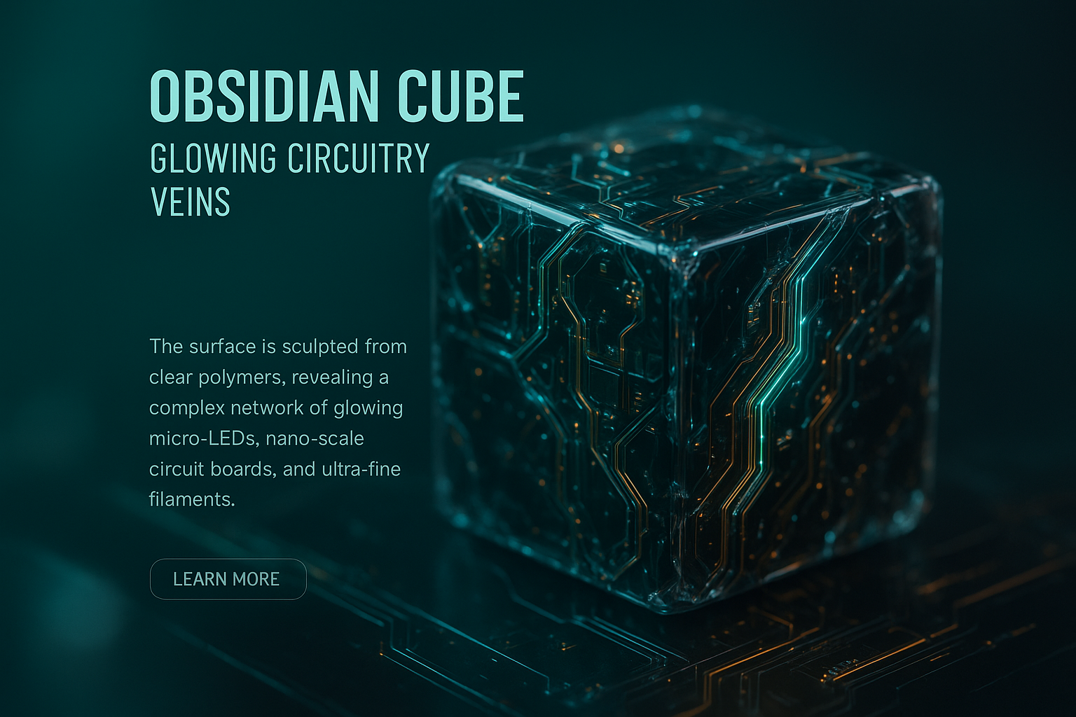/Collection: /by davooda/Type: PNG/A hyperrealistic image of an obsidian cube featuring intricate glowing circuitry veins. The surface is clear and glass-like, revealing a captivating inner world with micro-LEDs and mechanical filaments.