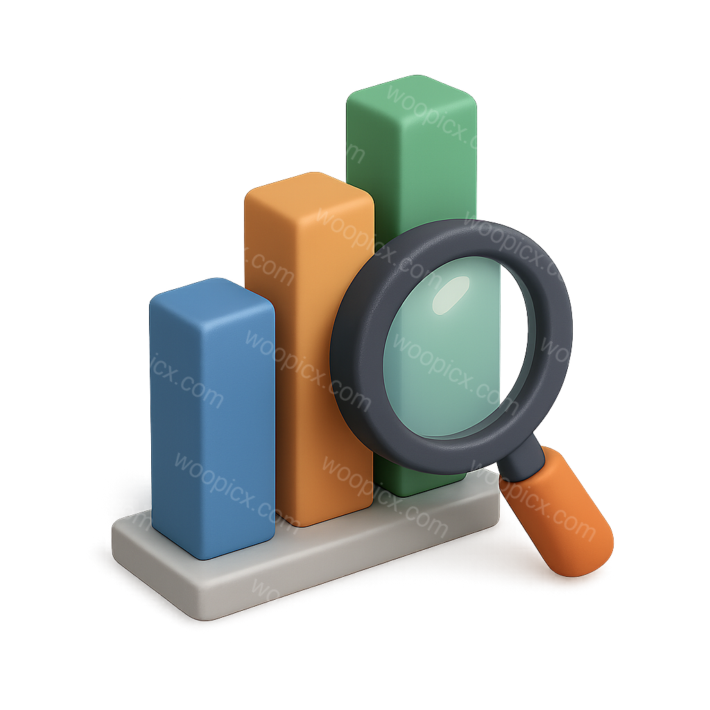 /Premium/Collection: /by davooda/Type: PNG/A 3D bar chart icon featuring three vertical bars in varying colors, accompanied by a magnifying glass. The design has a transparent background and showcases an isometric, volumetric aesthetic.
