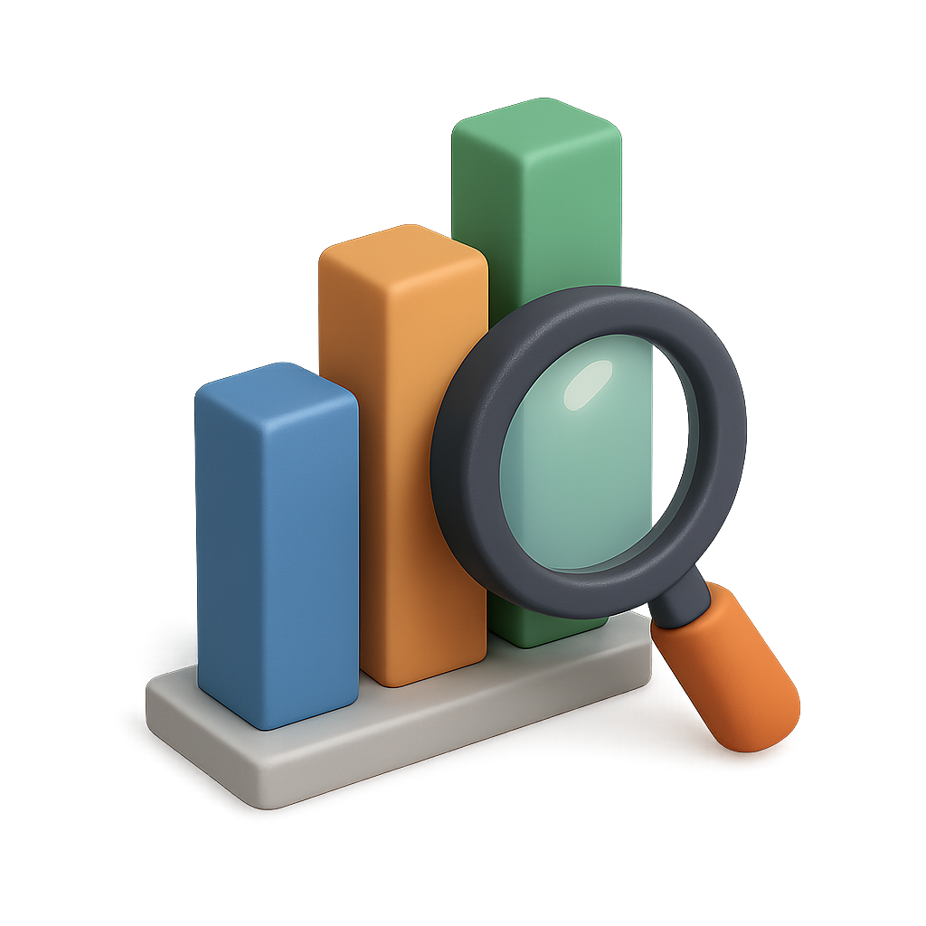 /Collection: /by davooda/Type: PNG/A 3D bar chart icon featuring three vertical bars in varying colors, accompanied by a magnifying glass. The design has a transparent background and showcases an isometric, volumetric aesthetic.