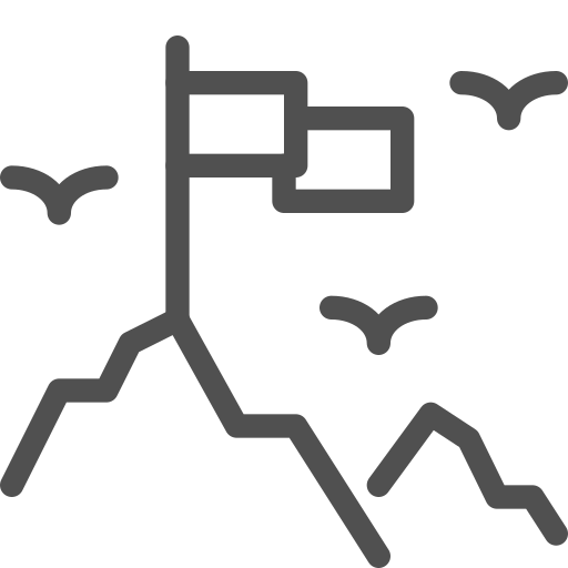 outline simple icon: business strategy, flag on peak, goal achievement, mountain, success