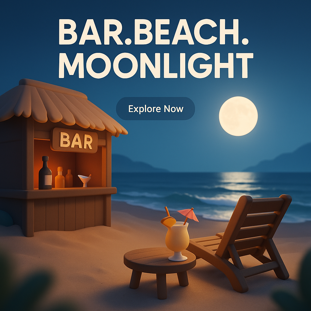A whimsical 3D illustration of a beach bar scene illuminated by moonlight, featuring a casual lounge chair and tropical drinks, ideal for vacation promotions or travel content.