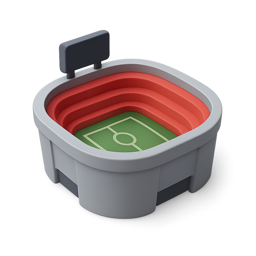 A visually appealing 3D icon of a sports stadium, showcasing a three-quarter view with a transparent background, featuring a green field and red seating.